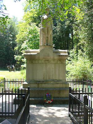 This memorial is dedicated to the Local Veterans from the First and Second World Wars. Names of the dead of the Great War appear on the front, those who survived on the back. Names of the soldiers from the Second World War appear on the right side, on the bottom. It was erected by the Eugenia Ladies' Community Group. Limestone base with life-sized statue of a soldier on guard above. A black metal fence surrounds the memorial. Beautiful memorial in a wonderful park setting, with a scenic waterfalls not far away.