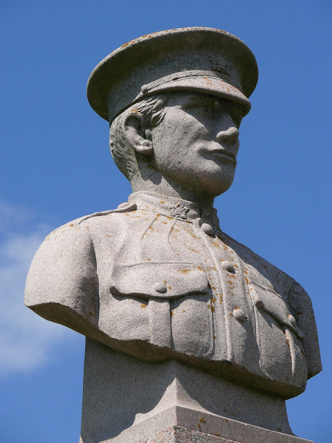 An attractive memorial of red granite topped with a bust of a WWI soldier, this monument was erected in 1922. It is flanked by two German MG08 machine guns, reportedly brought back from Vimy Ridge. The grounds are well kept and the memorial in excellent condition. A fine tribute to the heroes of the past wars and to the 5,000 citizens of this township who take pride in their memorial.