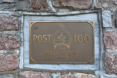 This memorial was erected in 1930 by the Royal Canadian Legion Branch 160. It was re-dedicated in 1986 with a new plaque. The memorial acts as the entrance to Wellington Park, which grants public access to the shore of Lake Ontario. The Wellington Cenotaph is composed of two stone wing walls with benches, each leading to a pillar. On top of both pillars are three wooden rifles arranged in a tripod configuration and topped by a First World War era British helmet.
