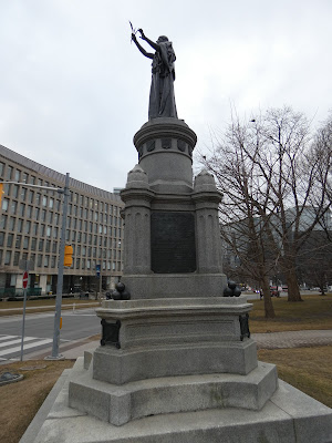 "In 1894, at age nineteen and having only minimal training as a sculptor, Walter S. Allward won a competition to design a bronze statue of Peace for the Northwest Rebellion Monument in Toronto. The monument had been proposed by a group of Toronto women who began raising funds in the early 1890s. In 1894, the committee hired Toronto based D. McIntosh & Sons to provide a pedestal and to supervise Allward’s progress. The pedestal, designed by McIntosh employee James Wilson Gray, is made of grey granite, twenty feet high, and ornamented with the insignia of the various regiments that took part in the Northwest Resistance.