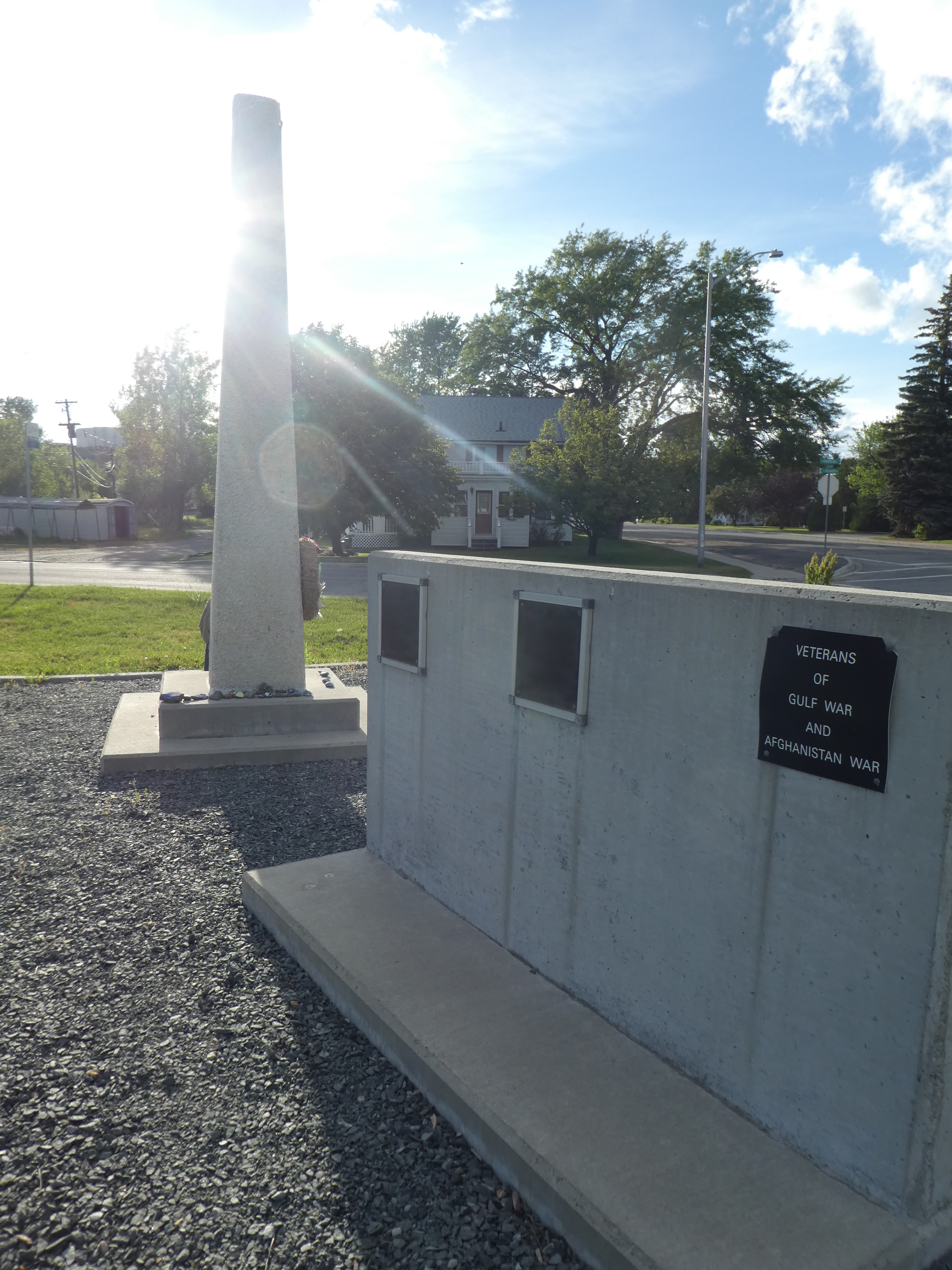The memorial consists of a tall concrete obelisk with a stylized sword at the top and a smaller concrete wall with two plaques on the front and three smaller plaques on the back. The area surrounding the memorial is well landscaped and has a bench to rest and reflect. The two plaques on the front of the wall are dedicated to the brave men of this area who died in the World Wars. The Great War plaque is dedicated to the men of nearby INCO towns, the second is strictly for men from Copper Cliff who died in the Second World War.